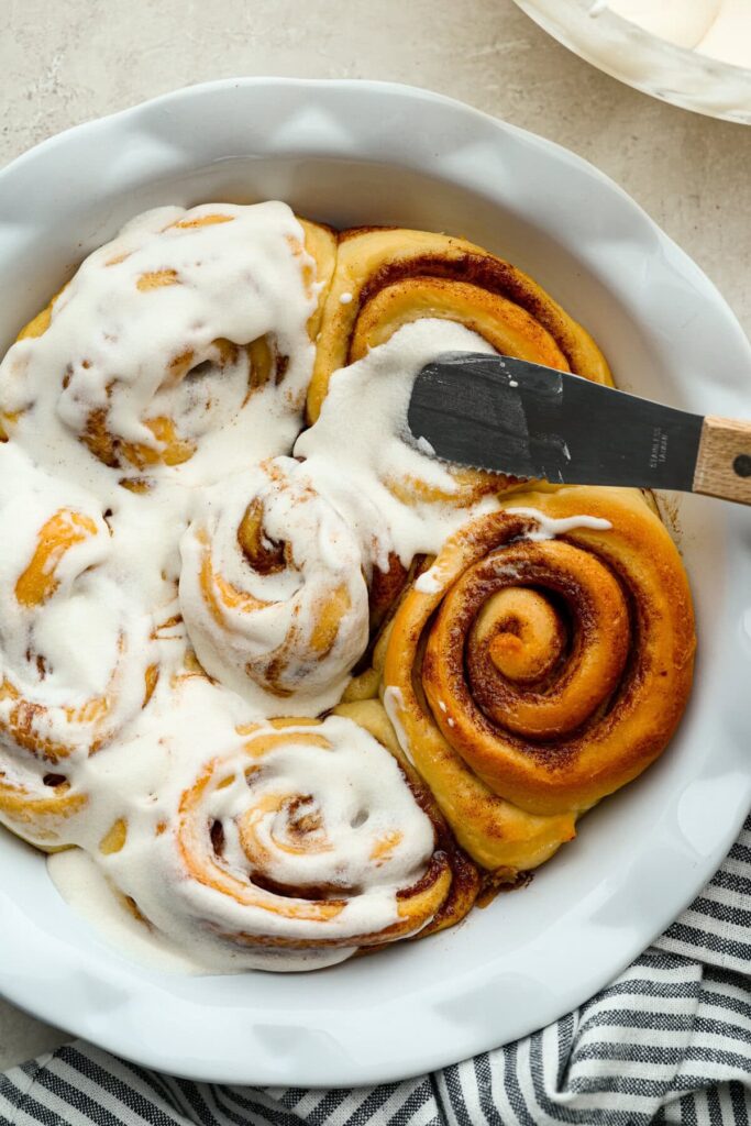 Add the remaining powdered sugar, 1 teaspoon vanilla extract, and 2 tablespoons of the 4-5 tablespoons milk or heavy cream until combined and smooth. Continue to add milk or cream 1 tablespoon at a time until the icing reaches your desired consistency. Spread evenly over warm cinnamon rolls.