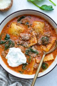 Million Dollar Soup is creamy, comforting, and worth every bite! The tomato base is rich and loaded with sausage, cheesy ravioli, and cream. Don’t skip