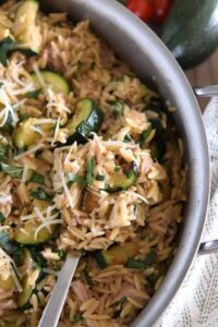 This one pan orzo with tuna and zucchini is flavorful and delicious and comes together so fast as everything cooks in one skillet or pan.
