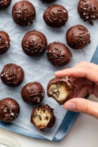 Cookie Dough Truffles You’ll dip these safe-to-eat cookie dough truffles in chocolate, then top them with chocolate sprinkles and a pinch of sea salt. They’re