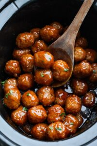 Slow cooker bourbon meatballs are an easy, set-it-and-forget-it favorite. Frozen meatballs simmer in a sweet, sticky bourbon sauce, making them perfect for an appetizer or