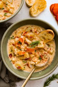 Creamy, indulgent Lobster Chowder takes only 40 minutes to make and is incredibly flavorful! Tender potatoes, crisp bacon, and luscious lobster are enveloped in a